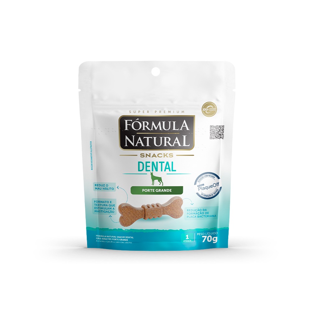 Fórmula Natural Snacks é uma linha de petiscos com ingredientes naturais e funcionais, que visa atender aqueles tutores que querem oferecer um cuidado adicional na nutrição dos seus cães. Saborosos e com textura diferenciada, a linha conta com quatro versões: antiestresse, vitalidade, pele e pelagem e dental. Fórmula Natural Snacks Dental atua na redução da formação da placa bacteriana por meio de dois mecanismos de ação: PlaqueOff® e hexametafosfato de sódio, ingredientes que ajudam a reduzir a placa bacteriana e a formação do tártaro, respectivamente. Esse petisco tem formato e textura que auxiliam na limpeza dos dentes, através do atrito durante a mastigação.