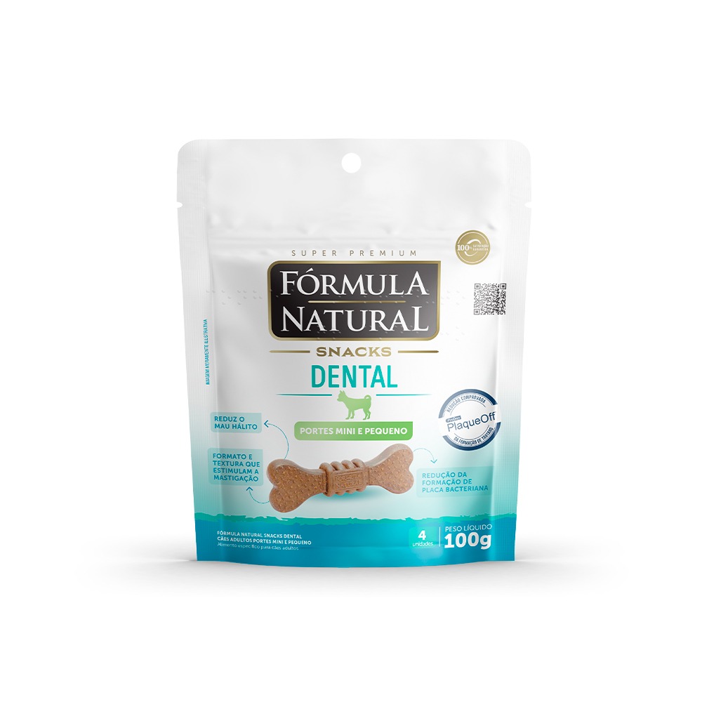 Fórmula Natural Snacks é uma linha de petiscos com ingredientes naturais e funcionais, que visa atender aqueles tutores que querem oferecer um cuidado adicional na nutrição dos seus cães. Saborosos e com textura diferenciada, a linha conta com quatro versões: antiestresse, vitalidade, pele e pelagem e dental. Fórmula Natural Snacks Dental atua na redução da formação da placa bacteriana por meio de dois mecanismos de ação: PlaqueOff® e hexametafosfato de sódio, ingredientes que ajudam a reduzir a placa bacteriana e a formação do tártaro, respectivamente. Esse petisco tem formato e textura que auxiliam na limpeza dos dentes, através do atrito durante a mastigação.