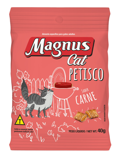 MAGNUS CAT PETISCO GATOS ADULTOS SABOR CARNE é uma forma de agrado que promove a interação prazerosa. Não se deve substituir a refeição pelo petisco e se deve adequar a quantidade oferecida pelo nível de atividade de seu gato.