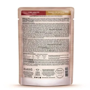 Carne de frango, cabeça de frango, dorso de aves, fígado de suínos, rim de suínos, plasma sanguíneo desidratado de suíno, gelatina, farinha de batata doce, farinha de trigo, amido modificado de milho, dextrose, proteína isolada de soja, proteína texturizada de soja, óleo de aves, biomassa de microalgas desidratada (Schizochytrium sp.), celulose, levedura de cana de açúcar hidrolisada e desidratada, extrato de Yucca schidigera, subproduto da extração da L-cistina, sulfato de glicosamina (0,05%), sulfato de condroitina (0,03%), cloreto de sódio, carbonato de cálcio, cloreto de potássio, água, glicina, cloridrato de L-cisteína monohidratado, DL-metionina, vitamina D3, vitamina E, vitamina K3, vitamina B1, vitamina B2, vitamina B6, vitamina B12, vitamina C, niacina, cloreto de colina, ácido pantotênico, ácido fólico, biotina, iodato de cálcio, cobre aminoácido quelato, ferro aminoácido quelato, manganês aminoácido quelato, zinco aminoácido quelato, goma guar, carragena, goma xantana, tripolifosfato de sódio, caramelo I.