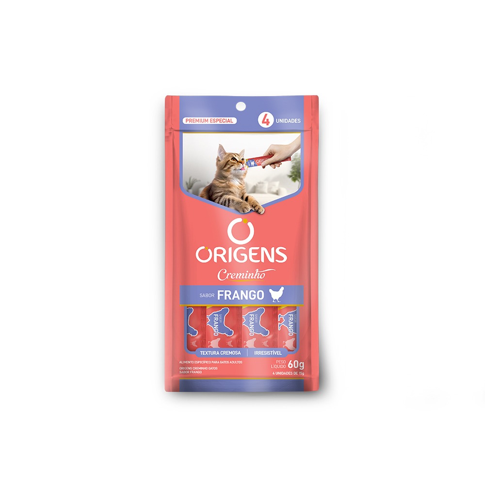 Origens Creminho é uma linha de petiscos com textura cremosa que vai proporcionar momentos únicos de interação entre o tutor e seu gato! Os produtos Origens Creminho foram formulados com ingredientes selecionados e de alta qualidade, como as carnes frescas, que estimulam o apetite do gato e agradam os paladares mais exigentes. Além disso, são petiscos saudáveis, formulados sem a inclusão de grãos, ingredientes transgênicos ou corantes e conservantes artificiais. Com alto teor de umidade, Origens Creminho ainda favorece uma maior ingestão de água e tem baixa caloria. Origens creminho está disponível em três opções de sabores irresistíveis: carne, frango e salmão.